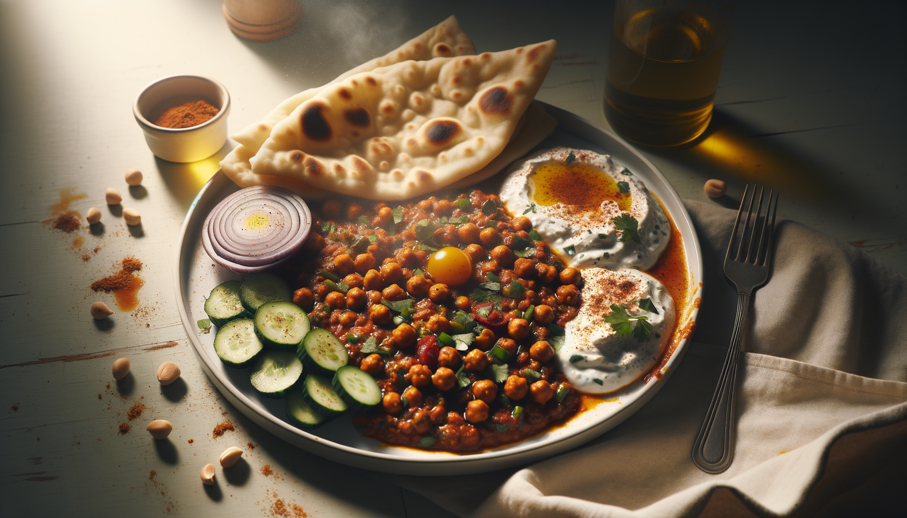 Dive into a plate of warm, aromatic chana masala paired with homemade garlic naan and a refreshing cucumber raita. This dish brings the vibrant flavors of Indian cuisine to your table, perfect for a cozy night in. It's a delightful balance of spice, warmth, and coolness that will whisk your taste buds away on a culinary journey.