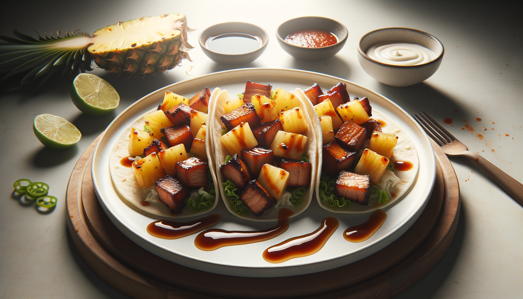 These tacos are a tribute to the street food of East Asia and the playful spirit of modern fusion cuisine. The Char Siu pork draws from Cantonese barbecue traditions, while the pineapple and Sriracha creme add a tropical American twist.